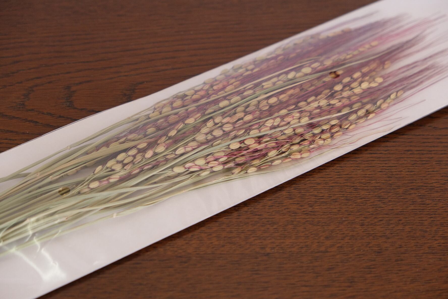 穂先の赤い「ひげ(芒)」が美しい品種。